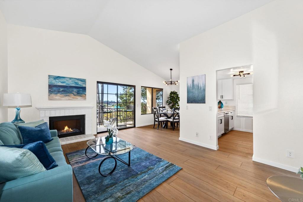 The one you’ve been waiting for! Welcome to this beautifully remodeled 2-bedroom, 2-bath condo in the desirable Avocado Gardens community of San Marcos — where modern design meets comfort, privacy, and mountain views. Step inside and immediately notice the soaring vaulted ceilings in the living and dining areas, creating an open, airy feel rarely found in condos at this price point. Natural light fills the space, drawing you toward the modernized fireplace featuring contemporary “Fire & Ice” crushed glass — a stunning focal point that adds both warmth and style. The fully remodeled kitchen is thoughtfully designed with quartz countertops, white shaker cabinetry with soft-close doors and drawers, and stainless-steel appliances. From the kitchen, dining area, and private balcony, enjoy peaceful mountain views and the added benefit of no rear neighbors. Luxury vinyl plank flooring runs throughout the main living areas, complemented by designer three-tone paint and matte black ceiling fans that carry a timeless black-and-white aesthetic from room to room. The spacious primary suite offers dual closets and a dual-vanity ensuite bathroom, providing both functionality and comfort. The secondary bedroom and bath are equally well-appointed, ideal for guests, a home office, or roommates. Even the attached garage has been upgraded — freshly painted with a sleek epoxy-coated floor for a clean, finished look. The building itself is gated for added privacy, and residents enjoy access to Avocado Gardens amenities including a pool, spa, and playground. Located just minutes from California State University San Marcos, with convenient access to I-15 and Highway 78, this home offers both style and everyday practicality. Turnkey. Elevated. Ready for its next owner.